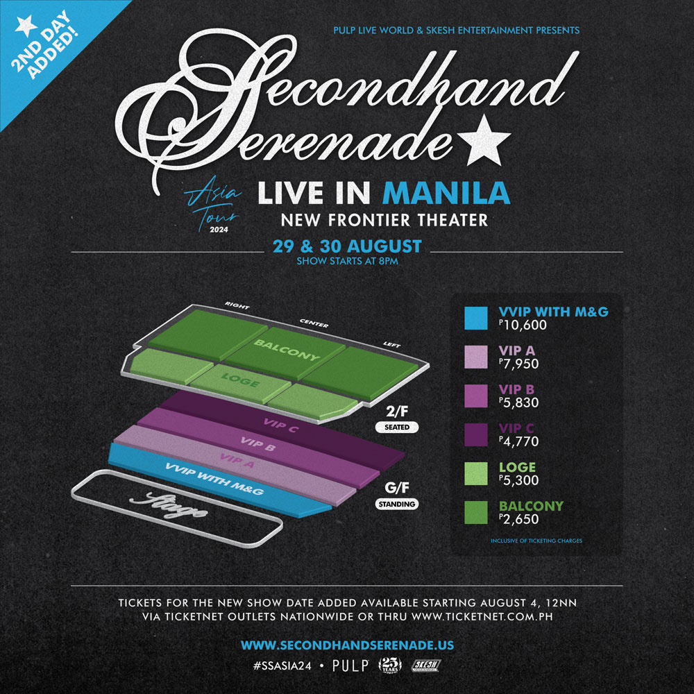 Tickets for August 29’s SECONDHAND SERENADE Asia Tour 2024 Live in Manila will be made available on August 4, 2024, at 12 noon PH time via Ticketnet outlets nationwide and through ticketnet.com.ph. Ticket prices are as follows: