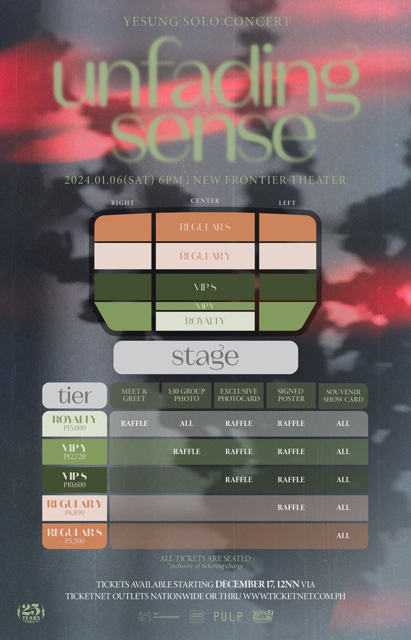 YESUNG's artistry, combined with the passion of Filipino ELFs and CLOUDS, is sure to create an atmosphere of pure musical bliss on January 6, 2024, at the New Frontier Theater. Tickets for YESUNG SOLO CONCERT 'UNFADING SENSE' IN MANILA will be available on December 17, 2023, at 12PM through TicketNet outlets nationwide and online.